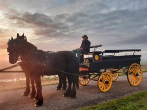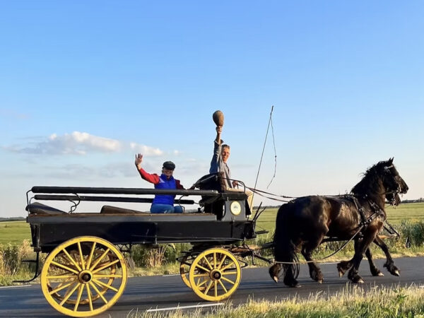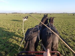 Met een  dubbelspan Friese paarden en het rijtuig Jan Plezier zien we de resultaten  van de vernatting van boerderij De Nije Mieden. We gaan langs de Sompe, waar veel grutto's,  tureluurs en andere weidevogels broeden. Ook gaan we langs de koeien die samen met hun kalveren in de weides lopen. Kalverliefde!