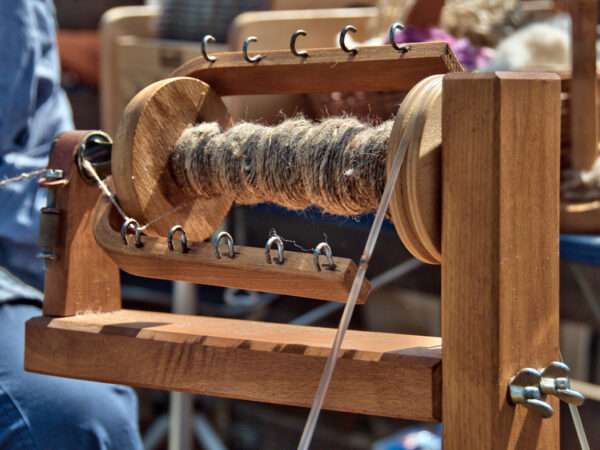 De Wolwerkplaats geeft een demonstratie kaarden, spinnen met tol en verschillende spinnenwielen.
